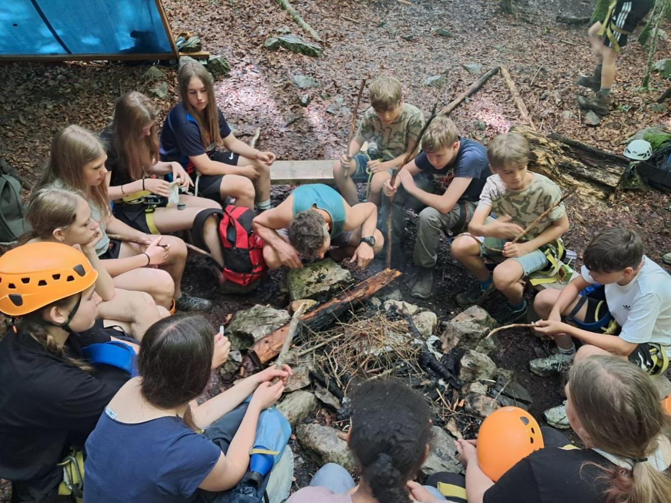Today my friends and I got a little bit sick. We had a bit of a sore throat. But we took some throat lozenges and it got better. Today we did a workshop on wilderness survival. We learned how to build a bridge over a river with two ropes. We built one and then balanced across it. I didn't fall into the water but two other girls did. Then we built a water filter and made our own fire. In the afternoon, we had the Team Olympics. My team came won the second place. We were proud of that because no adults were involved in our team and we all worked together very well.